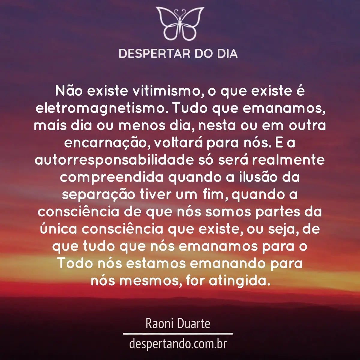 Não existe vitimismo, o que existe é eletromagnetismo. Tudo que emanamos, mais dia ou menos dia, nesta ou em outra encarnação, voltará para nós. E