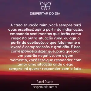 A cada situação ruim, você sempre terá duas escolhas: agir a partir da indignação, emanando sentimentos que terão como resposta outra situação ruim, ou agir