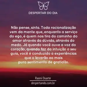 Não pense, sinta. Toda racionalização vem da mente que, enquanto a serviço do ego, é quem nos tira do caminho do amor através da dúvida,